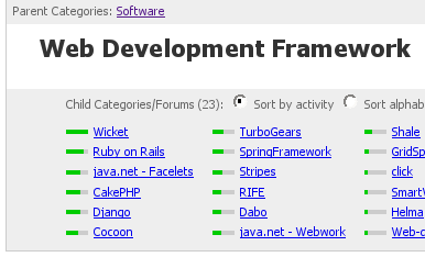 是地,我沒看錯,你也沒看錯。Web Framework 的排行目前以 Wicket 最為活躍,接下來才是 Ruby on Rails。後面則是些 facelets, cakePHP.... 等等其他技術。基本上如果沒有其他原因 (例如該技術已有專有的 forum 討論區,mailing list 只是輔助),個人建議不用考慮五名以外的 framework 了,不然最後累的是你自己。