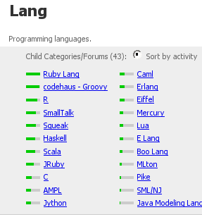 語言類的排行,嗯.... 不意外,以 Ruby 的討論最為活躍。但有趣的是,後面緊接著 Grooy,這可讓我摸不著頭緒了,Groovy 真有這麼多人用嗎?!hhmmm... 看來以後得花點心思在上面,目前想到 Groovy 最能運用的地方就是寫 Test,找個機會再來試試。