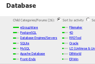 資料庫的就不大準了,因為絕大多數都有自己的 forum。不過大略看起來 PostgreSQL 算是 Open source RDBMS 的第二把交椅吧 (第一名永遠是 MySQL,不過最近它做了 一些砸自己腳的事...)