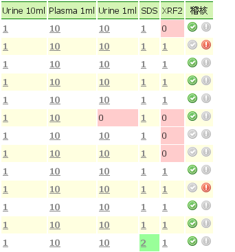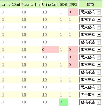 上圖稽核的狀態改用兩個圖示表示,兩個都是灰的表示尚未稽核,綠色表示已稽核,紅色則表示稽核不過。這樣一來,即使 table 上排滿滿了 100 個病人,也可以很快看出哪些病人還沒稽核,哪些是稽核有問題的。要切換狀態,只要在欲切換的圖示上點擊一次就行了 (有點類似常見的評比星星),而背後也是直接用 ajax 更新後端的資料。