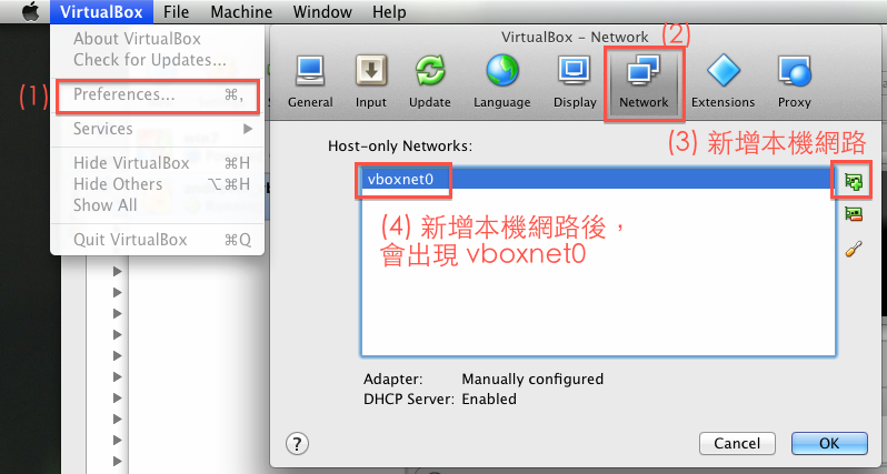 再來是設定 VirtualBox 本機的 DHCP。開啟 VirtualBox 後,到 Preference -> Network