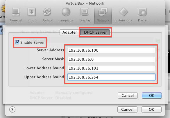 新增本機網路後,應該會出現一個 'vboxnet0' 的網路,double click 開啟它,切到 DHCP Server -> 勾選 Enable Server,再填入以下的值: