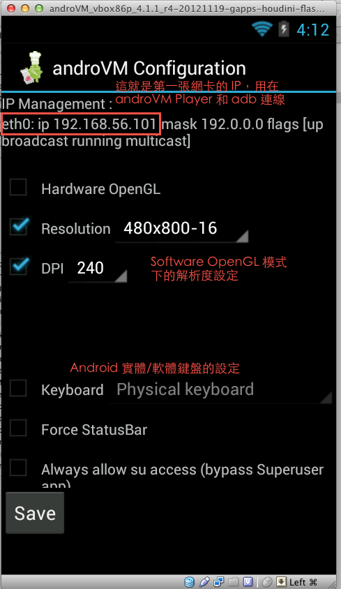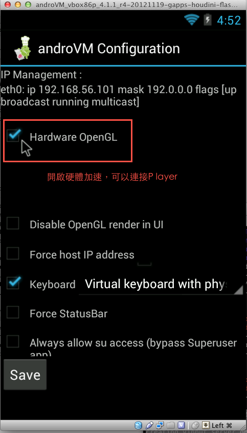 設定好,Save 完 AndroVM 要重開。