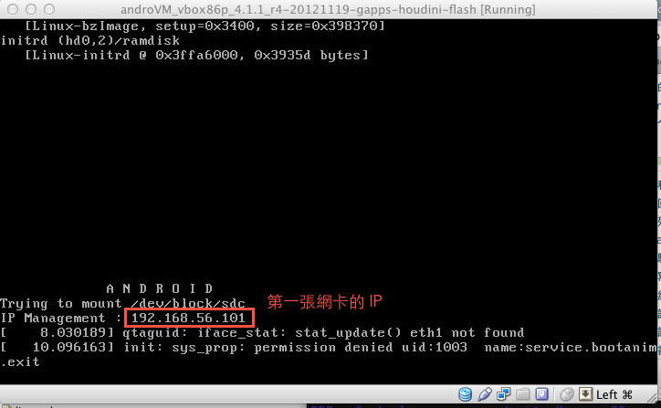 AndroVM 重開後,你會發現它不會直接進入 Android 了,它會開始搜尋 Player,它們之間是透過第一張網卡連線的,所以第一張要正確設定為 Host-Only 才能正確連接。成功連上後,AndroVM 會出現類似的訊息: