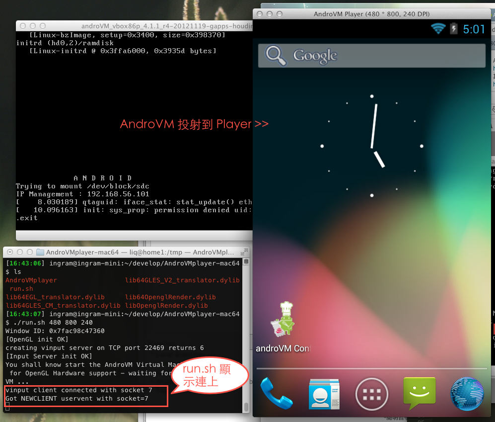 到此為止,androVM 開發環境算是設定好了。要注意的是,我們已經開啟 AndroVM 的硬體 OpenGL 模式,現在 AndroVM 開機後,就會開始等待 Player ,而不會直接進入軟體模式的 Android,除非它一分鐘內找不到 Player,它才會退回軟體模式。一旦進入軟體模式後,這時再開啟 Player 就不會互連了,你要重開 AndroVM 才行。