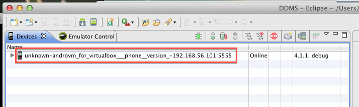$ cd ~/develop/android-sdk-mac_x86 # 這是你的 android sdk 目錄位置 $ cd platform-tools $ ./adb connect 192.168.56.101 # 192.168.56.101 這個 IP 要代入你的 AndroVM 的第一張網卡的 IP。