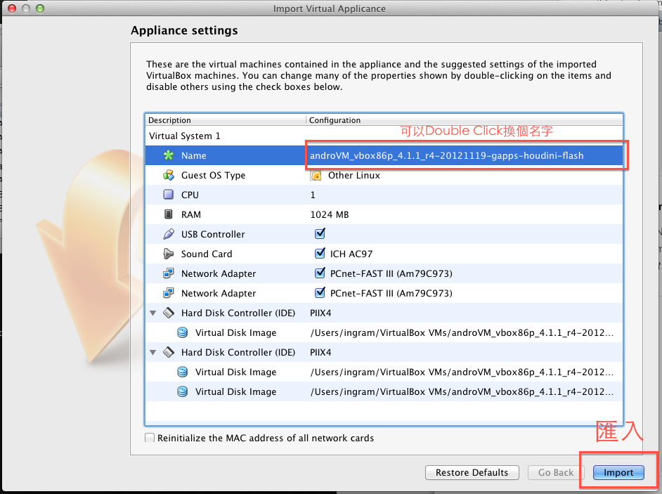 接下來就是匯入 AndroVM .OVA 檔到 VirtualBox 裡。double click 剛下載的 .ova 檔,就會出現匯入畫面: