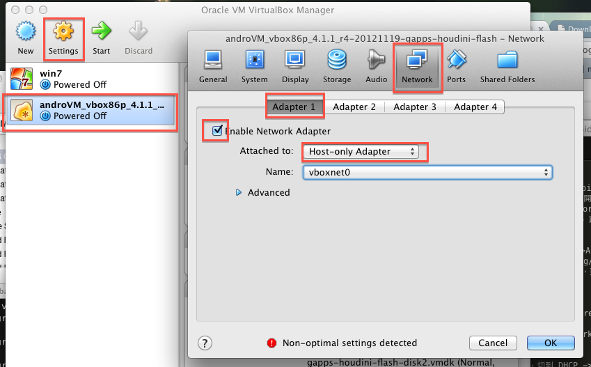 原來的名字太長了,你可以自己改。改完成功匯入後,接下來要幫 AndroVM 設定兩張網卡,選擇剛才匯入的 VM,再選 Settings -> Network -> Adaptor1 -> Attatch to: [Host-Only Adaptor]
