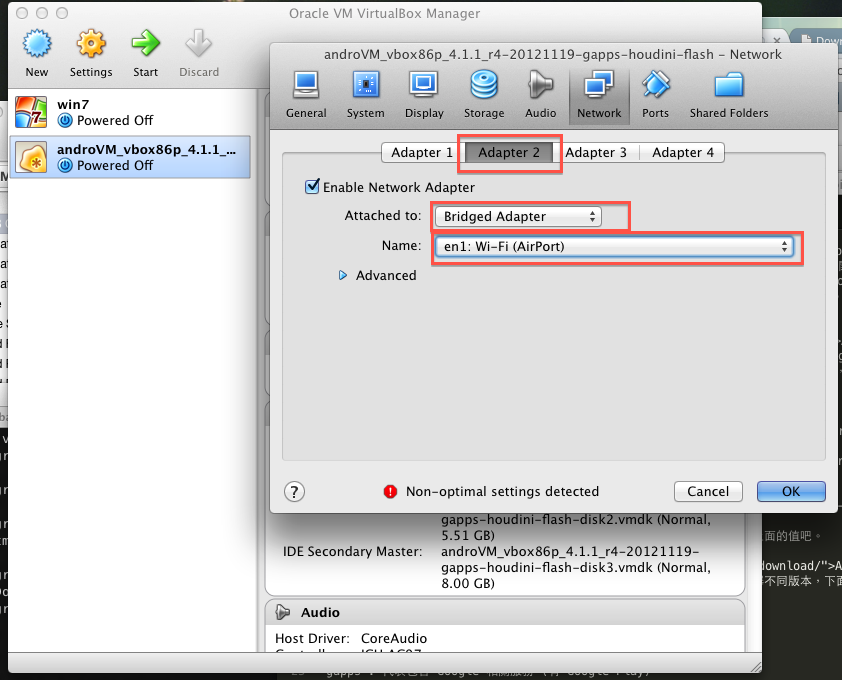 第一張一定要是 Host-Only,這是給 AndroVM 跟本機 OS 溝通用的,第二張則是 Android 本身要用的 (在 Android 裡會以 WIFI 呈現):