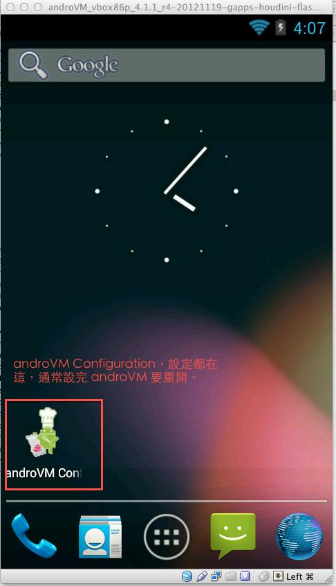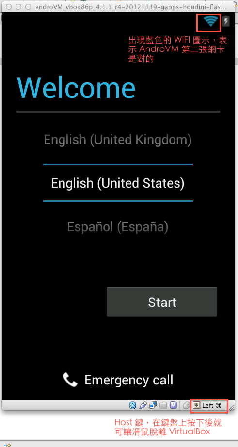 當你點擊到 AndroVM 時,你的滑鼠會被 VirtualBox 抓住,變成只能在 VM 裡移動,出不來。這時只要看右下角顯示的 Host 鍵,然後在鍵盤上按一下就可以出來了。(Host 鍵每個 OS 不同。圖例顯示的是 Mac 的左蝴蝶鍵)