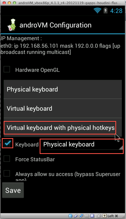 androVM Configuration 裡可以看到第一張網卡的 IP,這個 IP 會用在 AndroVM Player 和 adb 的連線上。另外也提供改變實體鍵盤的行為,以及軟體 OpenGL 模式下的解析度。預設的鍵盤設定是不會開虛擬鍵盤的,這樣和實際手機上的環境差太多,不利開發測試,下面將它改成虛擬鍵盤: